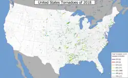 This page documents notable tornadoes and tornado outbreaks worldwide in 2018. Strong and destructive tornadoes form most frequently in the United States, Brazil, Bangladesh and Eastern India, but they can occur almost anywhere under the right conditions. Tornadoes also develop occasionally in southern Canada during the Northern Hemisphere's summer and somewhat regularly at other times of the year across Europe, Asia, Argentina and Australia. Tornadic events are often accompanied with other forms of severe weather, including strong thunderstorms, strong winds, and hail. There were 1,169 preliminary filtered reported tornadoes[1] and 1,121 confirmed tornadoes in the United States in 2018. Worldwide, 18 tornado-related deaths were confirmed; 10 in the United States,[2] four in Brazil, two in Indonesia, and one each in Argentina and Canada.