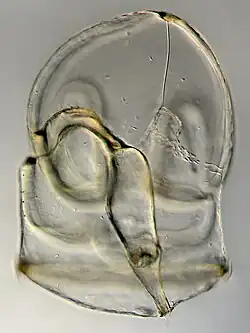 A tornaria is the planktonic larva of some species of Hemichordata such as the acorn worms.[1][2] It is very similar in appearance to the bipinnaria larvae of starfishes, with convoluted bands of cilia running around the body.[1] It is an oval shaped, transparent larva. The diameter of the body is about 3 mm. It has an apical plate, which is a thickened region provided by a tuft of cilia and a pair of eye spots. The larva has a complete alimentary canal. The ciliary band stretches throughout the anterior and posterior region, and also the postoral region.