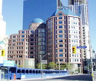 Completed in 1988 by Toronto firms Shore Tilbe Henschel Irwin & Peters and Mathers & Haldenby,[3] the twelve floor, 50m tall (164 ft.) building is an example of Postmodern architecture.[4] It was built to replace the older and smaller office on Jarvis Street.