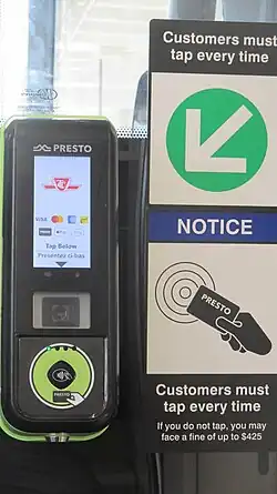 - ^ a b "New PRESTO screens rolling out on TTC buses, streetcars and on fare gates in stations". ttc.ca. Toronto Transit Commission. 24 September 2021. Archived from the original on 24 September 2021.
