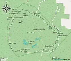 Torsburgen is the third largest fortified hill-fort in Scandinavia,[5] with an area of 112.5 ha (1.125 km2; 0.434 sq mi). It was most likely created during the Late Roman Iron Age (200 - 400 AD), the walls surrounding the area of the hillfort were made of dry stone, rubble from boulders, limestone, and a raised beach. While other hillforts in Sweden are described as vitrified, meaning the remains were turned to a glasslike substance by exposure to heat, Torburgen is a calcined hillfort, the remains of this site were reduced by roasting, leaving a different sort of rubble behind– it is sandy, almost black and strongly magnetic. In the latter case, the residue was a clayey to silty, yellowish brownish material. It is suggested that the walls of this fort were destroyed by fire from enemies.[10]