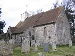 Two bells hang in the bellcote, one of which is engraved with the words 'S thomas treherne'. It has been suggested that this bell may have been taken from the nearby priory church soon after its desecration in the 16th century. But it may also be evidence of the church's original dedication to St Thomas alongside the name 'Treherne' who may have been either the maker or the donor of the bell. Since at least 1782 the turret, like that of nearby Ford church, has been boarded and painted white to provide a landmark for navigation on the river Arun.[6]