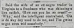 Sexual cruelty is documented: The 1853 case of Humphreys vs. Utz in the Louisiana Supreme Court awarded civil damages to a Madison Parish plantation owner whose overseer nailed a man's penis to a bedstead and then whipped him until he ripped his penis off the nail. The man, who was called Ginger Pop or Bob, was about 30 years old. He died shortly thereafter and was buried on the grounds of the plantation.[47] In June 1863, New York Times correspondent "De Soto" (William George)[48] reported witness statements describing genital burning and breast mutilation on a Black River plantation in Catahoula Parish, concluding his account "If any one, upon reading this...says he does not believe it, I have only to reply, I do."[49]