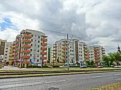 Along the street in downtown, old tenement houses are still standing (some with Art Nouveau style) but they don't form a continuous frontage. More recent suburban buildings -generally real estate complexes- are present in the further eastern portions.