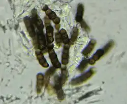 The conidia of T. herbarum are typically 3-5 celled, dark brown or black colour and rough-walled with prickly or spiny ornamentation resembling a burned crust appearance.[10][6] The apical cell is usually more lightly pigmented than the lower cells, and at maturity it tends to collapse inward forming a characteristic structure called a "corona (crown) cell".[1][9] The conidia are dry and form in unbranched or branched chains the break apart readily.[8] with textured walls either like studded elevations or smaller pricks or spines. The chains may have a zig-zag pattern where one branch is more dominant (sympodial growth).[8]