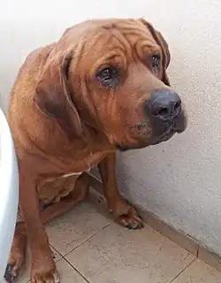 The Tosa[a], also known as the Japanese Mastiff,[3] is a dog breed of Japanese origin that is considered rare. It was originally bred in Tosa, Shikoku (present-day Kōchi), as a fighting dog and the only dog legally allowed in Japanese dog fighting.[4] Ownership is restricted in some countries as a dangerous breed.
