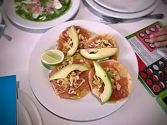 Tostadas (/tɒˈstɑːdə/ or /toʊˈstɑːdə/; Spanish: [tosˈtaða], lit. 'toasted') are various dishes in Mexican and Guatemalan cuisine based on toasted tortillas.