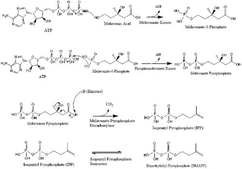 Mevalonate is finally converted to isopentenyl pyrophosphate (IPP) through two phosphorylation steps and one decarboxylation step that requires ATP.