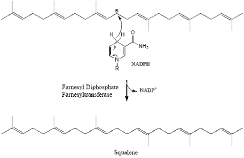 Two molecules of farnesyl pyrophosphate then condense to form squalene by the action of squalene synthase in the endoplasmic reticulum.[41]