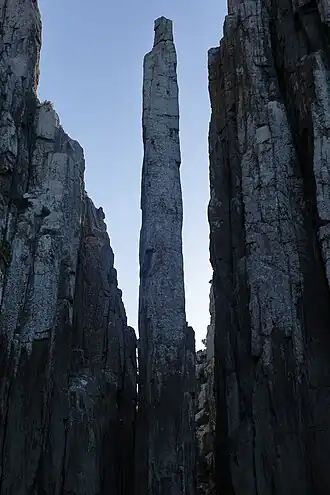 Tasmania is known for its igneous dolerite pillars, which are popular amongst climbers.[8] These pillars were formed by volcanic activity extruding magma from the ground, which when cooled at a constant rate creates rare hexagonal pillars.[9] These form via a slightly different mechanism to usual sea-stacks, and can be found at other rock-climbing sites around the state including Mount Wellington's Organ Pipes.