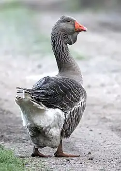 The Toulouse is a French breed of large domestic goose, originally from the area of Toulouse in south-western France. Two types are recognised: a heavy industrial type with dewlaps, the French: Oie de Toulouse à bavette;[4] and a slightly lighter agricultural type without dewlaps, the French: Oie de Toulouse sans bavette.[11]: 25  Both types are large, with weights of up to 9 kg.[12] Birds bred in the United Kingdom and United States exclusively for showing may be still larger, and have a somewhat different conformation.[13]: 378