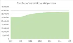 The number of Korean domestic tourists has increased since 2010. The number of people who participated in domestic travel (which includes one-day trips) was about 238.3 million (in 2015), increased by 4.9% compared to 2014 (227.1 million).[9] In 2014, Korean's domestic tourism expenditure was ₩14.4 trillion.[10]