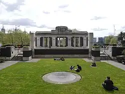 In his biography of Lutyens, Michael Barker described the design as "dignified classicism";[23] another Lutyens biographer, Christopher Hussey, described it as a "classical shrine".[24] Tim Skelton, author of Lutyens and the Great War, notes the similarity of the colonnade to the shelter buildings in Lutyens' cemeteries in France and Belgium and suggests that the memorial would be "equally well at home on the Western Front as in the heart of London".[25] The resemblance to the cemetery buildings is also noted by the Dutch architect Jeroen Geurst, who compares it in particular to those at Hooge Crater in Belgium and Serre Road in France.[26] In the opinion of the historian David Crane, the memorial never recovered from its "miserable start" and is consequently the least well-known of the IWGC's major works following the First World War.[6]