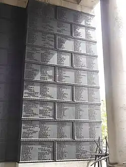The main structure is in Portland stone. It takes the form of a vaulted colonnade or pavilion reminiscent of a Doric temple but open at both ends.[1] After the Arch of Remembrance in Leicester, it is Lutyens' second-largest war memorial in the United Kingdom, and is the only British First World War memorial dedicated exclusively to merchant seamen.[10][16] It is raised on a platform slightly above street level, oriented east to west and accessed from the street by a set of five stone steps at each end. The structure is 21.5 metres (71 feet) long by 7 metres (23 ft) wide and up to 10 metres (33 ft) tall. It consists of three bays on either side, created by eight alternating square piers and six pairs of round columns. The eight piers are clad in rectangular bronze panels to give the impression of rustication. The panels (divided into 24 numbered sections) contain the names of missing mariners, ordered by ship name and then alphabetically following the name of the captain or master. The vessels of the Merchant Navy and Fishing Fleets are listed separately. Above the bays is a Doric entablature. The low, pitched roof has shallow parapets on either side and gabled ends; on top, in the centre, is a large square attic which supports a large stone drum. The attic is similar to Lutyens' original design for the York City War Memorial, which featured a Stone of Remembrance rather than a drum. The sculptural element is the work of William Reid Dick, who worked on several other war memorials, including the Menin Gate in Ypres, Belgium.[1][17][9][18][19]