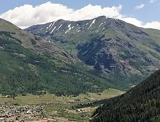 ![]() Tower Mountain (left) and Macomber Peak (right̟) rise above Silverton | |