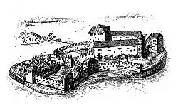 ![]() Vyborg Castle with Tower of St. Olav in the city map of Vyborg (1642) | |