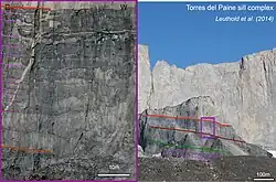 - ^ Leuthold, Julien; Müntener, Othmar; Baumgartner, Lukas; Putlitz, Benita (2014). "Petrological constraints on the recycling of mafic crystal mushes and intrusion of braided sills in the Torres del Paine Mafic Complex (Patagonia)" (PDF). Journal of Petrology. 55 (5): 917–949. doi:10.1093/petrology/egu011. hdl:20.500.11850/103136.