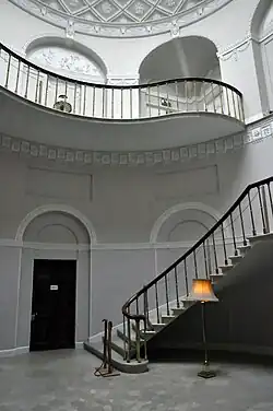 The house is 27 metres (89 feet) square, built in local stone with simple neoclassical lines, broken only by a Doric portico. The interior is dominated by a spiral staircase in a domed rotunda. The building replaced a previous house which once stood some 100 metres (330 feet) to the north of the present building