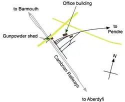 Originally called King's station after a local landowner,[2] it was not a passenger station at first, but a place for transhipment of slates from the narrow gauge to the adjoining Cambrian Railway.[1] Passenger trains started at the next station, Pendre.[1] The original TR plans included a spur into the standard gauge station called 'Railway No 2', but in the end it wasn't necessary, traffic wasn't sufficient and the powers to build it lapsed.