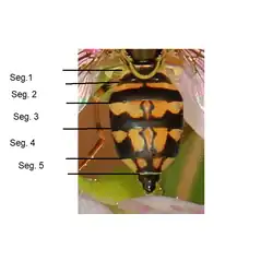 The abdomen of the female is broadly flattened and oval, and is broadest at the tip of the third segment. It is usually shining black with yellow markings as follows: a black band at the base of the first segment and a narrow median crossband, which is attenuated in the middle and interrupted, on the second segment. The third and fourth segments have a slender median stripe that is wider toward the front and a pair of large spots on the anterior margin that are dilated behind on the ends. The fourth segment is rather deeply marginate on each side behind and the ends are rounded and extend backward. The fifth segment has yellow anterior angles and sometimes two projections from the anterior margin near the middle. The hypopygium is reddish yellow, with the upper half shining black. In some specimens, the yellow cross-band of the second segment may be confined to a small spot on each side or be wholly absent, the median stripe of the third and fourth segments may be wholly absent, and there may only be four small anterior spots on the fourth segment. The spots on the anterior angles of the fifth segment may be very small, and the hypopygium may be almost wholly black. The front and middle are also usually black.