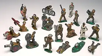 Different types and styles of toy soldiers have been produced over the years, depending on the cost and availability of materials, as well as manufacturing technologies. Here is a list of some of the most commonly collected varieties of toy soldiers.[5]
