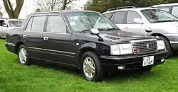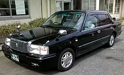- Super Saloon — introduced in 2002, this trim level was only marketed under the Crown Sedan nameplate. It added the "G Package" and chrome-finished alloy wheels as standard equipment, as well as longer bumpers. It was only available with LPG engines and was aimed primarily at corporate, government and sedan service buyers; door mirrors were standard, while fender mirrors were available for cars used in taxi service.[24][15] Due to the extended bumpers, Super Saloons exceeded the 4.7 m (15.4 ft) length threshold of Japan's "small-size passenger vehicle" classification and were instead classified as "normal-size passenger vehicles" as a result.[7]