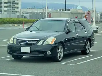 The Toyota Mark II Blit (Japanese: トヨタ・マークIIブリット, Toyota Māku II Buritto) is a mid-size station wagon manufactured by the Japanese automaker Toyota. It is the replacement of the Mark II Qualis and shared a platform with the X110 series Mark II rear-wheel drive sedan, while the Mark II Qualis is a rebadged XV20 series Camry Gracia wagon, with front-wheel drive layout. The Mark II Blit was introduced in January 2002 and ended production in June 2007 due to consolidation efforts. The car remained in production until three years after the Mark X came out, which replaced all of Toyota's X-body sedans, the Verossa, which in turn is a successor to the Chaser and the Cresta, and the Mark II. Toyota's official Mark II Blit successor is the front-wheel drive minivan, the Mark X ZiO, from September 2007. The Mark II Blit marked the return to the Mark II platform with rear-wheel drive layout with optional four-wheel drive and not a wagon version of the front-wheel drive Camry. The car was given a minor facelift in December 2004, including changes to the headlamps, grille and taillamps, which are replaced with LED units. The Mark II Blit uses six-cylinder engines with an optional turbocharger that was discontinued in May 2006, as a result of Japan's emission standards in 2005. The engines used were the 2.0 L 1G-FE, 2.5 L 1JZ-FSE, 2.5 L 1JZ-GE, and 2.5 L single-turbocharged 1JZ-GTE.