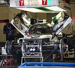 An initial shakedown of the car was performed at Aragon in late February 2016, with the car having covered over 22,000 km in testing prior to its public unveiling.[4] On 24 March 2016, ahead of the WEC Prologue, Toyota publicly unveiled the TS050 at the Circuit Paul Ricard. Compared to the TS040, the TS050 features a number of changes, with the naturally-aspirated 3.7-liter V8 engine being replaced by an all-new Toyota H8909 2.4-liter twin-turbocharged V6 engine for greater fuel-efficiency.[5] In addition to this, the capacitor hybrid energy storage system was replaced with a new lithium-ion battery system, with the car now moving to the 8-megajoule LMP1 Hybrid sub-class.[6] Initial photographs revealed that the car used a suspension concept appearing similar to that previously used in the TS040—a double wishbone arrangement with pushrod-actuated internal components paired with torsion bars. Compared to the TS040, the nose was also raised (a trait shared with its rivals, the Audi R18 and the Porsche 919 Hybrid), which allowed for a large opening beneath the nose, and for elements to be placed to tune airflow.[7]