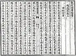 The Trần improved Chinese gunpowder,[5] enabling them to expand southward to defeat and vassalize the Champa.[6] They also started using paper money for the first time in Vietnam.[7] The period was considered a golden age in Vietnamese language, arts, and culture.[8] The first pieces of Chữ Nôm literature were written during this period,[9] while the introduction of vernacular Vietnamese into the court was established, alongside Literary Chinese.[10] This laid the foundation for the further development and solidifying of the Vietnamese language and identity.