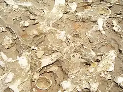 Ichnofacies are assemblages of individual trace fossils that occur repeatedly in time and space.[12] Palaeontologist Adolf Seilacher pioneered the concept of ichnofacies, whereby geologists infer the state of a sedimentary system at its time of deposition by noting the fossils in association with one another.[4] The principal ichnofacies recognized in the literature are Skolithos, Cruziana, Zoophycos, Nereites, Glossifungites, Scoyenia, Trypanites, Teredolites, and Psilonichus.[12][13] These assemblages are not random. In fact, the assortment of fossils preserved are primarily constrained by the environmental conditions in which the trace-making organisms dwelt.[13] Water depth, salinity, hardness of the substrate, dissolved oxygen, and many other environmental conditions control which organisms can inhabit particular areas.[12] Therefore, by documenting and researching changes in ichnofacies, scientists can interpret changes in environment.[13] For example, ichnological studies have been utilized across mass extinction boundaries, such as the Cretaceous–Paleogene mass extinction, to aid in understanding environmental factors involved in mass extinction events.[14][15]