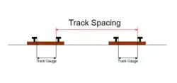 The track spacing is the distance between the track centres of double-track railway lines. There are standard distances derived from the standard loading gauge in a country. For high-speed trains and in tighter curves that distance needs to be increased.
