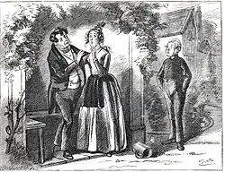 However, despite Tupman's protestations of affection she elopes with the engaging charlatan and trickster Alfred Jingle. Pickwick and Mr. Wardle pursue the couple to London where they pay off Jingle and rescue Rachael Wardle from an unhappy marriage.[7] Tupman writes to Mr Pickwick, "You do not know what it is, at one blow, to be deserted by a lovely and fascinating creature, and to fall victim to the artifices of a villain." Overcome with melancholy, Tupman absents himself from his friends with the intention of doing away with himself but instead is found by them at Cobham with his other great love - a plate of food.