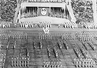Mass performance as old German tradition with athletes at the Central Stadium (Leipzig, GDR)