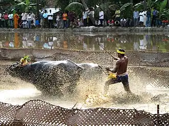 Kambala involves one person racing a pair of bulls across a paddy field.[151]