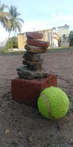 Gilli danda is similar to many other games around the world, such as the English game of tip-cat,[74] and also has similarities to the British sport of cricket, which is one of the reasons that sport became popular throughout South Asia in the colonial era.[75] It is a game where a player hits a short stick on the ground up into the air using a longer stick held in their hand. They then hit the airborne stick with the hand-held stick again so that it travels as far as possible. If a player on the other team catches the stick before it touches the ground, then the hitter is out (eliminated).[76][77]
