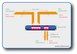 Some taps, particularly fiber taps, use no power and no electronics at all for the pass-through and monitor portion of the network traffic. This means that the tap should never suffer any kind of electronics failure or power failure that results in a loss of network connectivity. One way this can work, for fiber-based network technologies, is that the tap divides the incoming light using a simple physical apparatus into two outputs, one for the pass-through, one for the monitor. This can be called a passive tap. Other taps use no power or electronics for the pass-through, but do use power and electronics for the monitor port. These can also be referred to as passive.