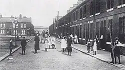 In 1898 a large plot of land was sold to Edmund Nuttall & Co. for the construction of 1,200 houses. The houses were never built, but the land later became the site of Trafford Park Village, known locally as The Village.[78] The announced arrival of the Westinghouse factory initiated development; in 1899, Trafford Park Dwellings Ltd was formed, to provide housing for the anticipated influx of new workers. Nuttall's land was acquired, and by 1903 more than 500 houses had been built, rising to over 700 when the development was completed in 1904. In 1907 it was estimated that the population of the Village was 3,060. The development was laid out in a grid pattern, with the roads numbered instead of being named. Avenues numbered 1 to 4 run north–south, streets numbered 1 to 12 run east–west.[79]