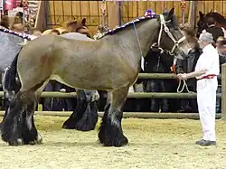 The revival of team driving has prompted farmers who use the Trait du Nord to attend competitions and improve the quality of their horses.[4] The qualities of the breed make it a popular horse for leaders in the areas of recreational and competition team driving, and the breed has the advantage of being able to be immediately returned to work even after a period of inactivity for several months.[5] When being driven, a traditional "Flemish collar" is generally used. The horses are trained to be driven with only one rein, leaving the driver's hands free for other work.[26] When shown in hand, Trait du Nord horses are often presented in groups, generally between four and eight to a string.[27]