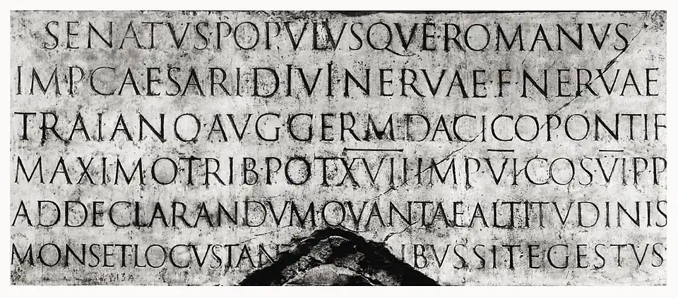 - ^ a b Rudolph, Becky. "Column for Trajan - Honorific Inscription". Piranesi in Rome. Wellesley College. Retrieved 18 September 2023.