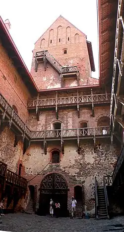 Trakai Island Castle (Lithuanian: Trakų salos pilis) is an island castle located in Trakai, Lithuania, on an island in Lake Galvė. The construction of the stone castle was begun in the 14th century by Kęstutis, and around 1409 major works were completed by his son Vytautas the Great, who died in this castle in 1430. Trakai was one of the main centers of the Grand Duchy of Lithuania and the castle held great strategic importance. The castle was rebuilt in the 1950s–1960s by Lithuanian initiative, although it had received resistance from Soviet authorities. The Trakai History Museum was established after the reconstruction.[3]