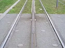 A ground-level power supply system, also called surface current collection or alimentation par le sol (APS), is an updated version of the original stud type system. APS uses a third rail placed between the running rails, divided electrically into eight-metre powered segments with three-metre neutral sections between. Each tram has two power collection skates, next to which are antennas that send radio signals to energize the power rail segments as the tram passes over them.