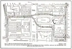 After approval by the magistrate, the project was resubmitted to the Chief of Police. He prohibited the use of the Augustabrücke bridge over the Landwehr Canal, so that the Großgörschenstraße – Dönhoffplatz line had to be postponed. The city was also refused permission to lay tracks in Petersburger Straße. Shared use of the GBS tracks failed as the latter made excessive financial demands. The terminus of this line was therefore initially at Elbinger Straße. There were further changes in Friedrichstadt, where the GBS successfully intervened against the track construction in Friedrichstraße and the end point of the line coming from Kreuzberg was moved to Behrenstraße.[2]