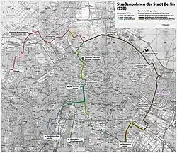 In April 1921, the two remaining former municipal lines were assigned the numbers 13 (red/white) and 9 (green). Line 13 was renamed Line 4 in the spring of 1922 and closed via the Großer Stern to form the "Ost-West-Ring", which largely corresponded to the planned "Städtischer Großer Ring".[2][15] The line from Seestraße to Bornholmer Straße, which had already been built by the municipal tramway, went into operation on October 12, 1928. On the same day, line 8 to "Nordring" was closed.[10][16]