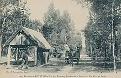 The metre-gauge forest railway originally started at the La Combe à Massé quarry in 1868. Initially used mainly by workers and employees for silvicultural work, the forest railway was also used by summer visitors after reforestation was completed. In the newspaper Le Gaulois of 21 July 1884 and 11 August 1884, an advertisement appeared for "visits by forest railway to La Palmyre, La Coubre, the Pavillon Bonne-Anse, the Pointe Espagnole, the Galon d'Or, the forest and dolmens of Combots, the forest of Arvert, etc."[4][17]