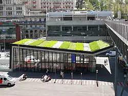Among the changes were the creation of hubs at locations such as Lausanne-Flon station where a new TL information and sales kiosk was built, replacing the previous one at nearby Place St. François.[9] The building has a green wall covering 200 m2 (2,200 sq ft)[9] and 600 m2 (6,500 sq ft) turf roof,[8] with a rainwater recovery system.