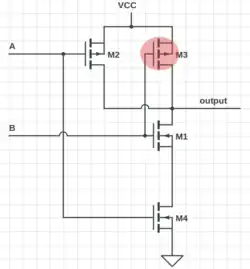 In the example picture, a faulty PMOS transistor in a CMOS NAND Gate is shown (M3-highlighted transistor). If M3 is stuck-open, then in case we apply A=1 and B=0 then the output of the circuit will become Z. And if M3 is stuck-short, then the output will always be connected to 1, and it also may short VCC to GND in case we apply A=B=1.
