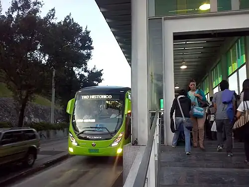 A number of lines would be opened without the dedicated right of way, between 2014 and 2016. "Centro Historico" which operates in the Historic centre was the first of these new lines to open in 2014. The "Eje Nor-oriente" line began operation in 2014 to serve Zone 18 from the Atlantida neighbourhood and the Downtown core. At the same time, construction of stations was ongoing for the new line "Eje Norte". This line opened in April of 2015 and was later renamed line 6 after the Zone in which it terminates from the downtown core.[2] In January of 2016 a new short line named "Hipodromo" opened to serve the Hipodromo neighbourhood and the downtown core. This line would also serve as a sister line to "Eje Central", and introduced express services to the UMG university campus.[3]