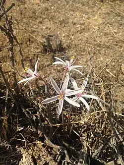 Traubia modesta is a bulbous plant with small,[8] ovoid,[9] brown bulbs bearning linear, 8–12 cm long, and 2–3 mm wide leaves.[8]