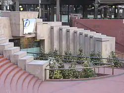 Following a $2.7 million renovation, the lobby at Pioneer Courthouse Square became a full-service visitor center in June 2001.[33] POVA's Ticket Central outlet began operating at the visitor center. Previously, POVA and Ticket Central operated at the World Trade Center on Front Avenue.[34][35] The visitor center at Pioneer Courthouse Square saw 40,665 people in June 2001, a 198 percent increase from June 2000. The lobby saw 207,782 visitors during June–September 2001, a 157 percent increase from 80,890 visitors during the same months in 2000. The renovation also included a remodeled TriMet counter, a theater, and restroom improvements.[36] In 2002, the visitor center was leaking and required extensive repairs. The Oregonian reported, "large plastic sheets are tacked to the ceiling below the skylights and covering tourist brochures in a display case at the [POVA] counter. Water is pooling in the ceiling sheets over employees' heads and computers. Big plastic buckets and tubs are placed on the floor in spots where water drips constantly."[37]