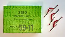 A treasury tag,[1] India tag,[2] or string tag[3] is an item of stationery used to fasten sheets of paper together or to a folder. It consists of a short length of string, with metal or plastic cross-pieces at each end that are orthogonal to the string. They are threaded through holes in paper or card made with a hole punch or lawyers bodkin or electric drill, and the cross-pieces are sufficiently wide as to not slip back through the holes.[4]